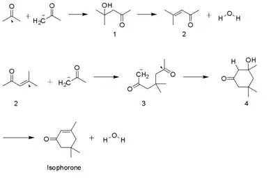 Izoforon se v přírodě nevyskytuje, na jeho výrobu bylo vyvinuto několik postupů. Nejčastěji používaná metoda zahrnuje autokondenzaci acetonu s KOH. Dehydrogenovaný aceton umožňuje uhlíkovým atomům na jedné molekule atakovat centrální (tedy karbonylový) uhlík druhé molekuly acetonu. Při této reakci vzniká diacetonalkohol (4-hydroxy-4-methylpentan-2-on)(1), jeho dehydratací se tvoří mesityloxid(2) a voda jako vedlejší produkt. Dehydrogenovaný aceton poté může dále v Michaelově reakci reagovat s mesityloxidem na 4,4-dimethyl-2,6-dioxoheptan-1-id (3), který atakuje vlastní karbonylový uhlík za vzniku 3-hydroxy-3,5,5-trimethylcyclohexan-1-onu (4). Dehydratací tohoto produktu se nakonec utvoří izoforon.