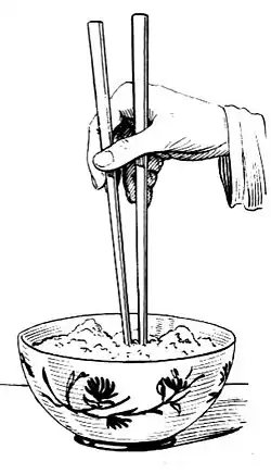 nechat jídelní hůlky v misce rozevřené do tvaru písmene "V" je nezdvořilé (tvar "V" je považován za symbol smrti[zdroj?])