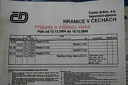 Podle § 54 Dopravního řádu drah vydává provozovatel dráhy pro potřebu cestujících vývěsný jízdní řád pro každou trať, jízdní řád dráhy a pro každou stanici a zastávku seznam „Příjezdy a odjezdy vlaků“. Vývěsný jízdní řád a seznam „Příjezdy a odjezdy vlaků“ včetně jejich oprav se zveřejňují nejméně 24 hodin před jejich platností, jízdní řád dráhy a jeho změny musí být zveřejněny nejméně 15 dnů před počátkem jejich platnosti. Vývěsný jízdní řád tratě, na kterém se stanice nachází, a navazujících tratí, seznam „Příjezdy a odjezdy vlaků“, musí být ve stanicích veřejně přístupné, platné a v použitelném stavu.