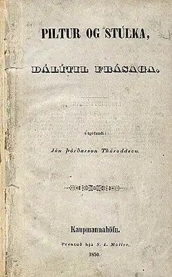 Roku 1850 vydal román Piltur og stúlka (Chlapec a dívka), považovaný za první dílo tohoto žánru na Islandu. Dílo bylo dokončeno těsně předtím, než se Jón vrátil na Island. Je to romantický milostný příběh s realistickými prvky odehrávající se především na islandském venkově. Jeho hlavními hrdiny jsou Sigríður a Indriði. Sigríður pochází z bohaté rodiny a Indriði je chudá. Proto Sigríðurova matka jejich lásce nepřeje a rozdělí je. Oba odcestují do Reykjavíku, kde je na rozdíl od idylického venkova život plný nástrah. Později se ale po mnoha nedorozuměních znovu shledají na milovaném venkově a jejich láska skončí svatbou. Přitažlivost románu spočívá předevšíím v autorových výstižných satirických náčrtech lidí a míst a v komických až v groteskních vedlejších postavách.[7]