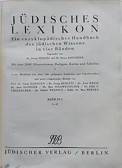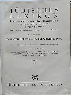 - Georg Herlitz, Bruno Kirschner (Hrsg.): Jüdisches Lexikon. Ein enzyklopädisches Handbuch des jüdischen Wissens in vier Bänden. Jüdischer Verlag, Berlin 1927–1930. (Bd. 1: „A–C“, 1927; Bd. 2: „D–H“, 1928; Bd. 3: „Ib–Ma“, 1928; Bd. 4.1: „Me–R“, 1930; Bd. 4.2: „S–Z“, 1930) [Nachdruck der 1. Auflage: Athenäum Verlag, Frankfurt am Main 1987, ISBN 3-610-00400-2].