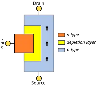 Zúžení vodivého kanálu je dosaženo elektrickým polem: napětí mezi elektrodami G a S aplikované v závěrném směru P-N přechodu, čímž dojde k rozšíření vyčerpané vrstvy přechodu (viz depletion layer na obrázku nahoře), která zasahuje do vodivého kanálu a zmenšuje jeho průřez. Vrstva se nazývá vyčerpaná, protože z ní jsou odvedeny pohyblivé nosiče náboje, takže ji lze považovat prakticky za elektricky nevodivou.[1]