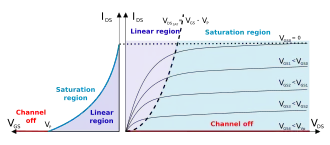 V oblasti saturace proud elektrodou D závisí na napětí mezi G a S, ale téměř nezávisí na napětí mezi D a S.