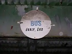 Pozůstatek po označení zastávky JUDr. Jan Hofmann se zamalovaným názvem podniku