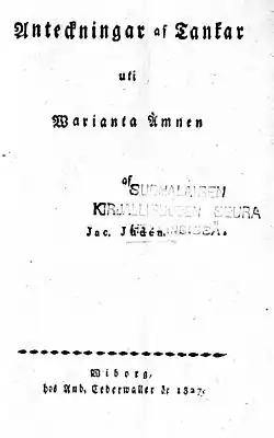 - Anteckningar af Tankar uti Varianta Ämnen (1827, Poznámky k úvahám o různých záležitostech), ve švédštině.