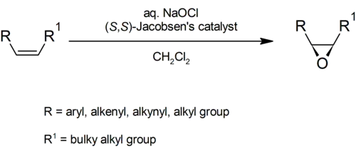 Jacobsenova epoxidace (také nazývaná Jacobsenova-Katsukiho epoxidace) je organická reakce, která umožňuje enantioselektivní epoxidaci alkenů substituovaných alkylovými a arylovými skupinami.[1][2][3] Jde o doplňkovou reakci k Sharplessově epoxidaci (při které se epoxidy připravují pomocí dvojné vazby allylových alkoholů). Stereoselektivita Jacobsenovy epoxidace je způsobena C2 symetrií komplexu ligandu salenového typu s trojmocným manganem, který se používá jako katalyzátor a přenáší kyslíkový atom z oxidačního činidla. Katalyzátory ovlivňující chiralitu produktů se používají k dosažení stereoselektivity, což má význam v syntéze biologicky aktivních látek a enantiomerně čistých léčiv.