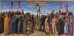 ![]() Zázrak sv. Kříže u mostu San Lorenzo (Vpravo dole klečí Jacopo Bellini, za ním jeho synovec Leonardo a zeť Andrea Mantegna; skupinu uzavírají Jacopovi synové Gentile a Giovanni) | |