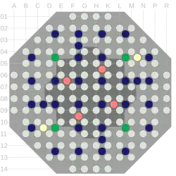 Schéma aktivní zóny reaktoru KS-150. Modře jsou označeny regulační tyče, zeleně tyče automatického řízení, červeně nouzové regulační tyče, žlutě ionizační kanály.