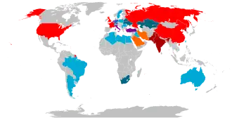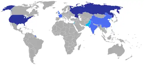 Podle Smlouvy o nešíření jaderných zbraní (Nuclear Non-Proliferation Treaty, NPT) je v současné době uznáváno pět jaderných velmocí: USA, Rusko, Spojené království, Francie a Čínská lidová republika. Dva další státy, Indie a Pákistán, které nebyly signatáři Dohody o nešíření jaderných zbraní, provedly jaderné testy – Indie v roce 1974 a Pákistán v devadesátých letech. Severní Korea odstoupila od dohody o jaderném odzbrojení v roce 2003, následně provedla vlastní jaderné testy. Jadernými zbraněmi disponuje pravděpodobně i Izrael, který informaci nikdy oficiálně nepotvrdil ani nevyvrátil. Ke Smlouvě o jaderném odzbrojení se nepřipojil. Otevřeně se nicméně přijímá fakt, že Izrael má jaderné zbraně. Postoj Izraele je však takový, že nechce být tím, kdo přinese jaderné zbraně do prostředí Blízkého východu.[2]
