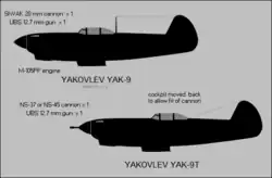 Na letadle Jak-9 se kladně projevila změna konstrukce s využitím deficitních hliníkových slitin. Konstrukce draku vycházející z Jaku-7 byla lehčí, což se projevilo na zvýšení užitečného nákladu (zejména zvýšením zásoby paliva). První prototypy vzlétly v roce 1942, poté byla ihned zahájena sériová výroba a v zimě se stroje zapojily do bojové činnosti. Na přelomu let 1942 a 1943 byla stíhačka dále zdokonalena. Byl instalován nový protitankový kanón 11-P-37 ráže 37 mm, což si vyžádalo posunutí kabiny Jaku-9 o 0,4 m dozadu. Později se montovaly i zbraně jiné ráže, například dvacetimilimetrový kanón MPŠ-20, třiadvacetimilimetrový MP-23-VV či jen velkorážový kulomet UBS. Montáží protitankových kanónů s protipancéřovým střelivem vznikly varianty pod označením Jak-9T. U typu Jak-9K byl experimentálně zabudován kanón ráže 57 mm. Naopak v roce 1944 byl do stíhačky instalován protitankový kanón ráže 45 mm. Mezi četnými verzemi byly i stíhací bombardéry Jak-9L a Jak-9B, vyzbrojený jen kulomety, přičemž do trupu byla umístěna pumovnice, v níž mohlo být zavěšeno až 400 kg pum (maximálně buď čtyři 100kg pumy FAB-100, nebo až 128 kusů kumulativních PT pumiček PTAB).[5]