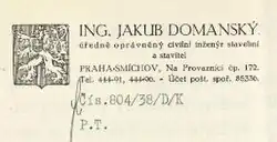 Civilní inženýr stavební Ing. Jakub Domanský, sídlem na Smíchově, složil dne 28. května 1926 u okresní správy politické na Smíchově předepsanou přísahu.[7]