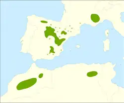 Druh vyrůstá rovněž v severní Africe v Maroku a Alžírsku, v pohořích Vysoký a Střední Atlas, na územích s celkovou rozlohou přesahujících 30 tisíc hektarů. Vystupuje tam až do výšky 2500 m n. m., ojediněle až 3000 m, kde obvykle roste na horní hranici lesa.[3][4][5]