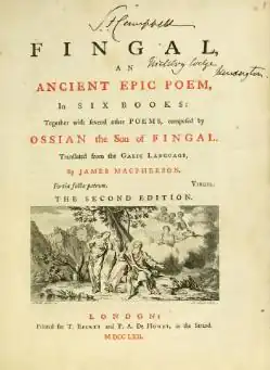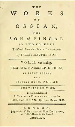 - The Works of Ossian, the Son of Fingal (1765, Díla Ossiana, syna Fingala), souborné dvoudílné vydání básní připisovaných Ossianovi s Macpersonovým a Blairovým pojednáním o staré skotské kultuře.[2] Tato literární mystifikace sehrála významnou roli v procesu nastupujícího romantismu . Vyjadřuje jeho nové životní pocity (stesk, zádumčivost, melancholii, tajemnost, vědomí zmarněné velké minulosti, nedosažitelnost ideálu), a to navíc v novém objevném uměleckém tvaru (fragmentárnost, zatlačení děje do pozadí reflexemi a stylistickými prostředky jako je například exklamace). Ossianovy básně byly přijímány jako výtvor severského génia označovaného za „Homéra Severu“.[7] Znamenaly rovněž mimořádný podnět pro rozvoj české prózy. Odhalení toho, že jde o padělek, inspirovalo v dalších zemích obdobné mystifikační pokusy kladoucí si za cíl umělé doplňování chybějící tradice (Rukopis královédvorský a zelenohorský, Velesova kniha a další).[3]