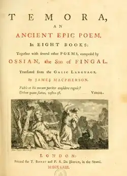 - Temora, an Ancient Epic Poem, in Eight Books: Together with Several other Poems composed by Ossian, the Son of Fingal (1763, Temora, starobylá epická báseň v osmi knihách, spolu s několika dalšími básněmi složenými Ossianem, synem Fingala). Epos, který získal své jméno podle názvu královského paláce prvních irských králů (historická Tara), vypráví o dalším tažení krále Fingala do Irska, tentokrát proti Cairbarovi, který se po Cuchullinově smrti neprávem zmocnil vlády, oslavuje Fingalovo vítězství, popisuje hrdinskou smrt Ossianova syna Oscara a je také doplněn dalšími lyrickoepickými skladbami.[5]