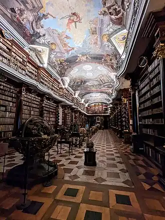 - Klenbu sálu knihovny Klementina a její cvikly zdobí fresky: kvadratura a figurální scény jsou soustředěny na klenbě o ploše 45 x 14 metrů. Alegorické scény symbolizují sedmero umění a zároveň sedm oborů, vyučovaných na pražské univerzitě: 1. Poznání přirozené (Alegorie Logiky), 2.Poznání zjevené (Alegorie Aritmetiky, s nápisem NUMERUS, první matematik počítá na prstech rukou, druhý počítá mince, chlapec sčítá na tabulce a uprostřed je tabule s magickým čtvercem o devíti číslech (která dávají v sloupcích, řadách i diagonálách vždy součet 15), 3. Alegorie Rétoriky: na lodi s nápisem TROPUSpřednáší rétor třem posluchačům, 4.Apollón obklopený devíti múzami na hoře Parnas (Alegorie Umění), 5. Proměnění Páně na hoře Tábor s Kristem mezi Eliášem a Mojžíšem, s přihlížejícími apoštoly Petrem, Ondřejem a Janem (Alegorie teologie ?), 6. Alegorie Filozofie s nápisem "Ratio" a třemi filozofy, z nichž lze podle lampy identifikovat Diogena. Sklánějí se nad knihou, označenou heslem: SCIENTIA/ NON/ HABET/ HOSTEM/ NISI/ IGNORANTEM (Věda nemá jiného nepřítele než nevědomost). Personifikace Nevědomosti má oslí uši a trhá listy z knihy. 7. Astronomové a geometři v přehledu věd chybějí, jsou namalováni na pilíři. Z jediného místa u vstupu do knihovny je perspektivně správně viditelná malba iluzivní kupole. Ve cviklech pod klenbou je vloženo 12 malovaných medailonů s portréty významných jezuitů, kteří buď prošli Klementinem (počínaje prvním rektorem koleje Petrem Canisiem a Rodrigem Arriagou, nebo byli jejich vzory jako Edmund Kampián Práce na freskách začaly v roce 1724, malovaným letopočtem je jejich ukončení datováno do roku 1727.[3]