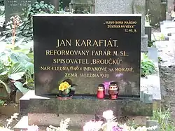 Jan Karafiát je pochován na Vinohradském hřbitově a na náhrobním kameni je charakterizován jako „reformovaný farář mimo službu, spisovatel Broučků“.