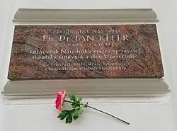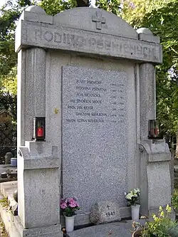 Byl pohřben do rodinného hrobu na Malvazinkách, oddělení D I, číslo hrobu 239. Původně zde bylo chybně uvedeno křestní jméno Josef. Až teprve roku 2015 nechal jeho syn tuto chybu opravit. O rok dříve umístila radnice Prahy 5 na hrob kámen z koncentračního tábora Flossenbürg. Kámen je označen letopočtem úmrtí.[2]