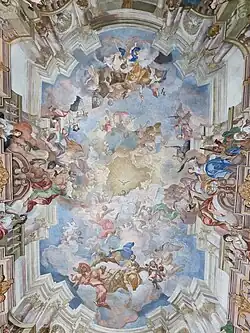 v klenbě pod kůrem: kolem 1732 – fresky Panna Marie a sv. Jan Evangelista, Nanebevzetí Panny Marie a Korunování Panny Marie