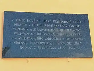 Na budově staré frymburské školy, dnes Penzion Stará Škola je pamětní deska s textem: V tomto domě ve staré frymburské škole působil v letech 1786–1838 český kantor varhanik a skladatel Jan Vojtěch Maxant který vychoval mnoho vynikajících hudebníků zvláště dvorního varhaníka a profesora vídeňské konservatoře Sechtera rodáka z Frymburka 1787 – 1867. Ve Frymburku je po něm pojmenován hotel a restaurace.