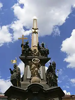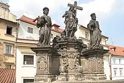 - ↑ Od dob Dlabacžových bylo sousoší mylně připisováno Ondřeji F. Quitainerovi a mladému Brokofovi. Teprve Jan Herain a Josef Teige (1906, 213) a po nich ještě Antonín Podlaha publikovali přesné archivní dokumenty o Mayerovi. Zprávy zhodnotil O. J. Blažíček v Dějinách českého výtvarného umění roku 1984