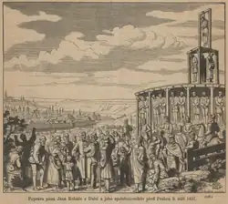 | „ | A přivedli sú sebú pana Jana Roháče a rytieře Vyška z Polsky a kněze Jana, řečeného Prostředka, a Zeleného puškaře s jinými mnohými, kdežto hned pan Roháč veden jest na rathúz, mučen a tázán; a tak těžce jeho zmučili, že z něho střeva plula. A nazajtří v podělí veden jest se všemi svými k šibenici; ač jest byl pán korúhevný a strýc páně Práčkuov, musil viseti na šibenici s tovaryši svými, kterýchž bylo na šedesát: Roháč najvýše a tito tří pod ním na jiné šibenici a pak jiné tepruov na obecní šibenice. A ciesař s hradu díval se s radostí. A když bylo po mši, z dopuštění božieho oheň pekelní zapálili jemu nohy, a tak od té nemoci žádný jemu pomoci nemohl. To když se stalo, ciesař rychle poslal posla, aby, jest-li živ, zase jeho přivedli a nic mu nečinili; a on již byl visal. A tak Pán Buoh všemohúci pomstil toho zřetelně. I byl velmi veliká pláč v lidu za dlúhý čas a vždycky lidé plakávali, když jest o tom jaká zmínka byla, jakož obecně lidé staří tak vyznávají. | “ |
