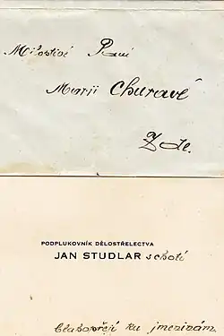 V pozůstalosti po synech plukovníka Josefa Churavého (1894–1942) byla nalezena obálka blahopřání ke jmeninám jeho manželky paní Marie Churavé (1897–1982). Autorem blahopřání je Jan Studlar (s chotí Irmou). Vnitřek blahopřání obsahuje oficiální vizitku Jana Studlara ještě v hodnosti podplukovníka dělostřelectva. Přání ani vizitka neobsahuje podpis Jana Studlara ani datum. Podle životopisu Jana Studlara pochází přání nejspíše z doby před rokem 1939 nebo z doby krátce po roce 1945.
