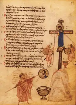 Patriarcha Jan VII. maže podobiznu Krista houbou. V pozadí ukřižování Ježíše Krista. (Chludowský žaltář, fol. 67r)
