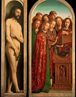 - Gentský oltář – 1432 – katedrála Sv. Bavona, Gent. Nejrozsáhlejší Eyckovo dílo. Pracoval na něm se svým bratrem Hubertem. Dodnes není jasné, který z obou bratrů přispěl ke vzniku díla více. Má se za to, že Hubert dílo započal a Jan jej dokončil. Klanění božímu beránkovi, ústřední motiv celého oltáře, nás jakoby vtahuje do svého děje. Jeho krajina je detailně propracovaná a celá je prolita světlem (ilustruje část apokalypsy sv. Jana; hlavní motiv Klanění božímu beránkovi: mnohafigurální kompozice; oltář obklopují andělé, nad oltářem se vznáší duch svatý v podobě bílé holubice; v popředí vpravo 12 apoštolů, vlevo ti, kdo „uvěřili v Krista dříve, než přišel“ (proroci, církevní otcové, pohan Vergilius v bílém – „křesťan duchem“); nahoře vpravo průvod panen a mučednic. Oltář není celý původní. Roku 1934 byla ukradena deska znázorňující Spravedlivé soudce, která byla nahrazena kopií)[5]