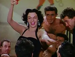 V produkci společnosti RKO Howarda Hughese ve filmu The French Line (1953) se ukázala v přiléhavých jednodílných plavkách s výkrojky. Hrála zde v provokativním muzikálovém čísle s názvem „Hledání problémů“. Ve své autobiografii uvedla, že odhalující plavky byly alternativou k Hughesovu původnímu návrhu bikin, což by byl pro film v roce 1954 velmi pikantní kostým. Říkala, že původně nosila bikiny před „šokovaným“ filmovým štábem, ale že „se cítila velmi nahá“.
