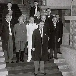 - Fumimaro Konoe – dvakrát byl japonským premiérem; v letech 1937 - 1939 a poté 1940 - 1941. Konoe měl úzké vztahy s armádními kruhy i s politickými stranami a japonskými finančníky. V roce 1940 založil Asociaci pro podporu trůnu a zahrnul do ní všechny do té doby existující politické strany. I po své druhé rezignaci zůstal vlivným činovníkem císařského systému, a to až do konce války. Dřív, než mohl být postaven před soud, spáchal na konci roku 1945 sebevraždu kyanidem draselným.[13]