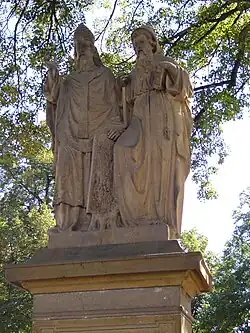 V letech 1863-1885 se na Moravě slavilo 1 000. výročí cyrilometodějské. Rok 1863 je datum příchodu obou věrozvěstů na Moravu, r. 1869 úmrtí sv. Cyrila a r. 1885 úmrtí sv. Metoděje. V Jaroměřicích znovu ožila tradice, domněnka, že tudy konali svou apoštolskou cestu do Čech. Tato misie sice byla spojována s kamenným křížem na návsi, ale zrodila se a uskutečnila myšlenka postavit v obci sousoší. Povedlo se to v roce 1886. O tom, jak se tato tradice v obci ujala, svědčí po půl století od postavení sousoší oslavované cyrilometodějské jubileum v roce 1935.