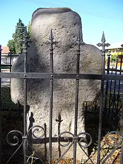 Kamenný poměrně prostorově nevýrazný kříž (143 x 80 x 25 cm) stojí v železné ohrádce ve středu vsi, hned vedle sousoší Cyrila a Metoděje a je taktéž spojován s cyrilometodějskou tradicí. Počátkem minulého století byl kolem něj postavena asi 1 m vysoká železná ohrádka, která obvodem vymezuje 2,25 m². Je vyroben z načervenalého pískovce, který se nikde na Malé Hané nevyskytuje a pochází z neznámého místa. Na přední straně je pět hlubokých rýh, které prý mají symbolizovat Kristovy rány. Kolem kříže je opředeno několik velmi starých pověstí a mýtů. Lidová tradice vypráví, že se tudy ubírali slovanští věrozvěstové – bratři sv. Cyril a Metoděj – do Čech a zde se zastavili. V Jaroměřicích prý kázali a u potoka, kde je nyní na návsi kamenný kříž, také křtili. Tato pověst je nejznámější a postupem času zatlačila do pozadí i ostatní verze o původu tohoto záhadného kamene.