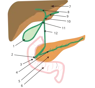 Schéma žlučových cest: 1. žlučník, 2. Oddiho svěrač, 3. vaterská papila, 4. pankreatický vývod, 5. slinivka břišní (pankreas), 6. dvanáctník (část tenkého střeva), 7. játra, 8. ductus hepaticus dexter, 9. ductus hepaticus sinister, 10. ductus hepaticus communis, 11. ductus cysticus, 12. ductus choledochus. Popsáno podle[26].