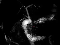 MRCP obraz. Choledocholitiáza. Dva žlučové konkrementy (šipka) v distální části ductus choledochus.