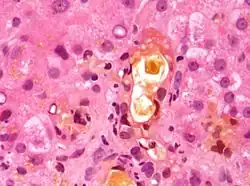Mikroskopický obraz městnání žluči v játrech. Degenerace hepatocytů – velké buňky s bledou flokulující cytoplazmou. Vzorek získán biopsií jater. Barveno hematoxylinem-eosinem.[18].