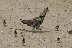 Prekociální a nidifugní kuřata do 24 h po narození opouští hnízdo a začínají si samostatně shánět potravu.[13] Mláďata se rodí obalena prachovým peřím, které je hned v prvním týdnu nahrazeno juvenilním šatem.[6][15] Koncem prvního týdne života již umí létat. Kuřata zůstávají v blízkosti matky do věku 12–15 týdnů.[12] Během tohoto období matka chrání své potomstvo před predátory, kteří zvláště na kuřata číhají v hojném množství. K obranným strategiím slepic patří hlavně zlákání pozornosti predátora na sebe pomocí syčení, mlaskání nebo simulace zlomeného křídla. V případě, že se predátor přiblíží na dosah, slepice hbitě vyletí do vzduchu a rychle uletí pryč.[6] K disperzi kuřat typicky dochází na podzim. Obecně platí, že samice odlétají dále než samci.[12]