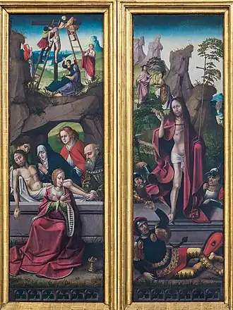 Pravé křídlo okřídleného triptychu v kostele Řádu německých rytířů, Vídeň, Rakousko. Dílo zobrazuje Ježíšovo ukřižování a pohřeb (vlevo) a jeho vzkříšení (vpravo).