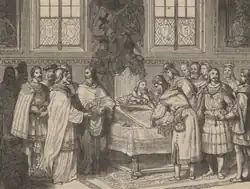 Vznik Zelenohorské jednoty roku 1465 (Česko-moravská kronika, ilustrace Josefa Scheiwla, 1872)