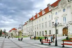 - Radniční náměstí (Plac Ratuszowy) – centrální náměstí v historickém jádru města; jeho zástavba prošla přestavbou v 60. letech 20. století: za renesančními, barokními či klasicistními fasádami se ve skutečnosti skrývají moderní bytové domy; uprostřed se nachází radnice z let 1744–1749 spojená v roce 1910 se stavebním komplexem Sedm domů (Siedem Domów), který byl rovněž přestavěn do současné podoby v 60. letech 20. století;[35] na náměstí stojí Neptunova socha z roku 1727, která symbolizuje dobré obchodní vztahy místních kupců se zámořskými zeměmi[36];