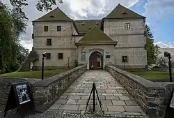 • Vodní tvrz – zbudována počátkem 15. století na místě obytné věže asi z poloviny 13. století. Unikátní doklad pozdně gotické architektury. Původní stavba jednopatrová obdélná budova. Na přelomu 15. a 16. století přistavěna boční křídla a vystavěna dvoupatrová hranolová věž. Po požáru v roce 1727 tvrz upravena na zámek – přistavěno druhé patro, prolomena okna a věž snížena o dvě patra. Okolo tvrze suchý příkop, dříve naplněný vodou. Tvrz byla po většinu času v majetku vratislavských biskupů anebo jejich leníků. Od roku 1932 v ní sídlí Vlastivědné muzeum Jesenicka.[25]