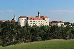 Starý zámek od severozápadu, v pozadí farní kostel svatého Josefa -