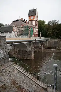 Secesní budovy na levém břehu Labe u jezu Hučák -