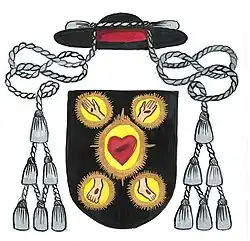 V černém poli znározněné Kristovy rány. Převýšeno pastýřským kloboukem černé barvy s šesti střapci.