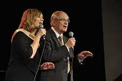 Jiří Suchý přebírá na vyhlášení cen Žebřík speciální cenu magazínu iReport za dílo. Na snímku s ředitelem Žebříku Jardou Hudcem (5. 4. 2023).Královna bublin (1999), k tomuto filmu napsal scénář a námět, hudbu i texty písní, režíroval ho, vytvořil kostýmy a hrál v něm