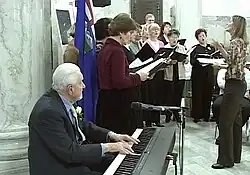 Své 95. narozeniny oslavil hrou na elektrické piáno v aule albertského parlamentu v Edmontonu.