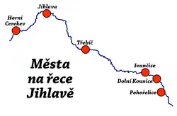 Jihlávka, Horní Ves, Horní Cerekev, Batelov, Dolní Cerekev, Kostelec, Dvorce, Rantířov, Jihlava, Malý Beranov, Luka nad Jihlavou, Bítovčice, Bransouze, Číchov, Přibyslavice, Třebíč, Vladislav, Kramolín, Mohelno, Biskoupky, Ivančice, Moravské Bránice, Nové Bránice, Dolní Kounice, Pravlov, Kupařovice, Medlov, Cvrčovice, Pohořelice, Přibice, Ivaň