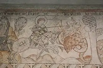 Malby ve Svatojiřském sálu – svatý Jiří bojující s drakemMalby ve Svatojiřském sálu – část erbovní galerie