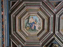 Alegorie čichu na kazetovém stropě v Pokoji smyslů Pokoj smyslů je nazvaný podle alegorií smyslů vyobrazených na kazetovém stropě z osmdesátých let 16. století. Malíř Raimund Paul ztvárnil zrak jako ženu držící zrcátko, kterou doprovází kočka a orel, čich jako ženu přičichávající ke karafiátu, kterou doprovází dva psíci. Chuť zobrazil jako ženu v bílém závoji s mísou ovoce u nohou a na klíně držící jablko, ovoce ochutnává i opička. Konečně hmat je jako chlapec držící ratolest a ovoce, ke kterému slétá okřídlený Saturn a který je obklopen zvířaty.[35] Na stěnách visí kopie tří portrétů od Jacoba Seiseneggera z roku 1529. Představují Adama I. z Hradce, jeho ženu Annu z Rožmitálu, k nim se řadí rozměrově menší skupinový dětský portrét bratrů Jáchyma z Hradce a Zachariáše z Telče. Originály obrazů rodičů se nacházejí ve Zlatém sále na zámku v Telči, zatímco originál obrazu jejich synů je na zámku Červená Lhota.[36][37][38][39] Dále je zde také portrét Adama II. z Hradce, syna Jáchyma z Hradce. Severovýchodní stěnu zdobí portréty Jáchyma Oldřicha z Hradce, posledního mužského člena rodu, a jeho manželky Marie Maxmiliány z Hohenzollernu.[40]