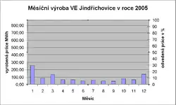 Jindřichovické větrné elektrárnyOdvedená práce pro farmu VE Jindřichovice, data roku 2005. Graf je v měřítku nominální práce, odpovídající instalovanému výkonu