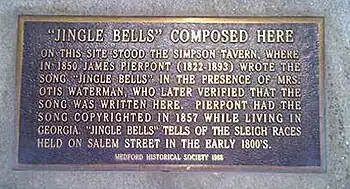 Otázkou však zůstává, kdy a kde Pierpont původně složil píseň, která se stala známou pod názvem „Jingle Bells“. Pamětní deska na ulici High Street 19 uprostřed náměstí Medford Square ve městě Medford ve státě Massachusetts připomíná místo zrodu a tvrdí, že Pierpont píseň napsal v roce 1850 v tehdejší hospodě Simpson Tavern. Předchozí vyprávění o místní historii tvrdí, že píseň byla inspirována oblíbenými městskými závody saní v 19. století.[7]